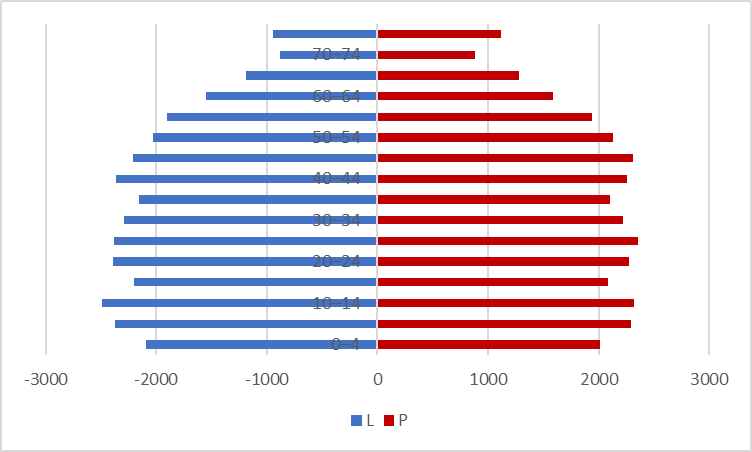 Komposisi penduduk menurut jenis kelamin per desa di wilayah Puskesmas Borobudur Tahun 2024 seperti tabel 2.1. Pada Grafik 2.4 menunjukkan bahwa jumlah penduduk di Kecamatan Borobudur paling banyak pada golongan umur 25-29 tahun.