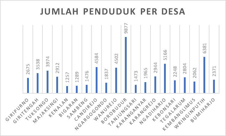 Jumlah penduduk Kecamatan Borobudur Tahun 2024 sebesar 65.335 jiwa. Jumlah penduduk menurut desa disajikan pada Grafik 2.2.