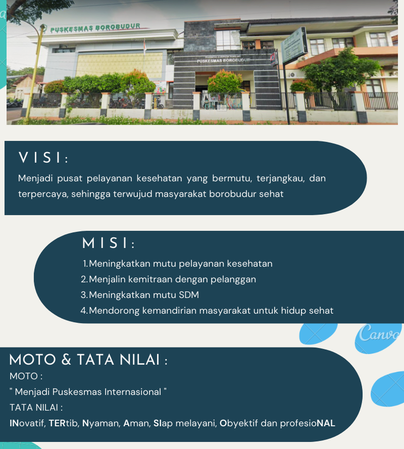 Menjadi pusat pelayanan kesehatan yang bermutu, terjangkau, dan terpercaya, sehingga terwujud masyarakat borobudur sehat